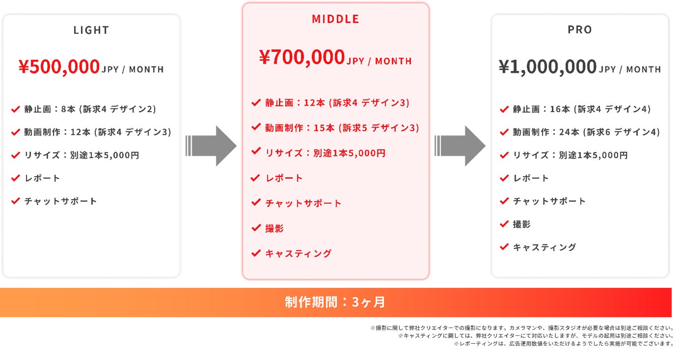 本サービスは、Meta・Google・TikTok等の運用型広告において、改善サイクルを前に進めるため、動画(縦型含む)を中心に静止画も含めたクリエイティブ制作リソースを、定額で提供します。制作物の種類やご希望の運用体制に応じて、以下のプランをご用意しています。
