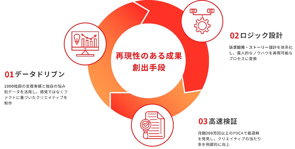 こうした課題を受け、当社はこれまで運用型広告およびダイレクトマーケティング領域で培ってきた知見をもとに、人に依存せず、再現性のあるクリエイティブPDCAを回すための定額制支援サービスを開発しました。