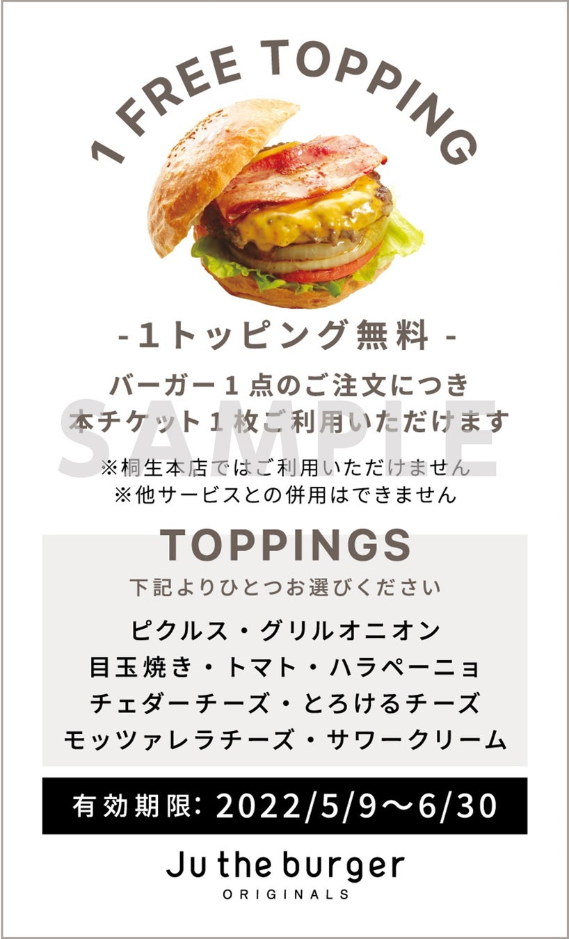 1つ目は、東銀座店と国分寺店にて、バーガーをご注文の方に、次回、購入時にご利用いただける「トッピング無料チケット」をプレゼントします。対象トッピングは全9種類!目玉焼きからモッツァレラチーズまで、自分だけのオリジナルバーガーをお楽しみいただけます。(桐生本店は使用不可)
