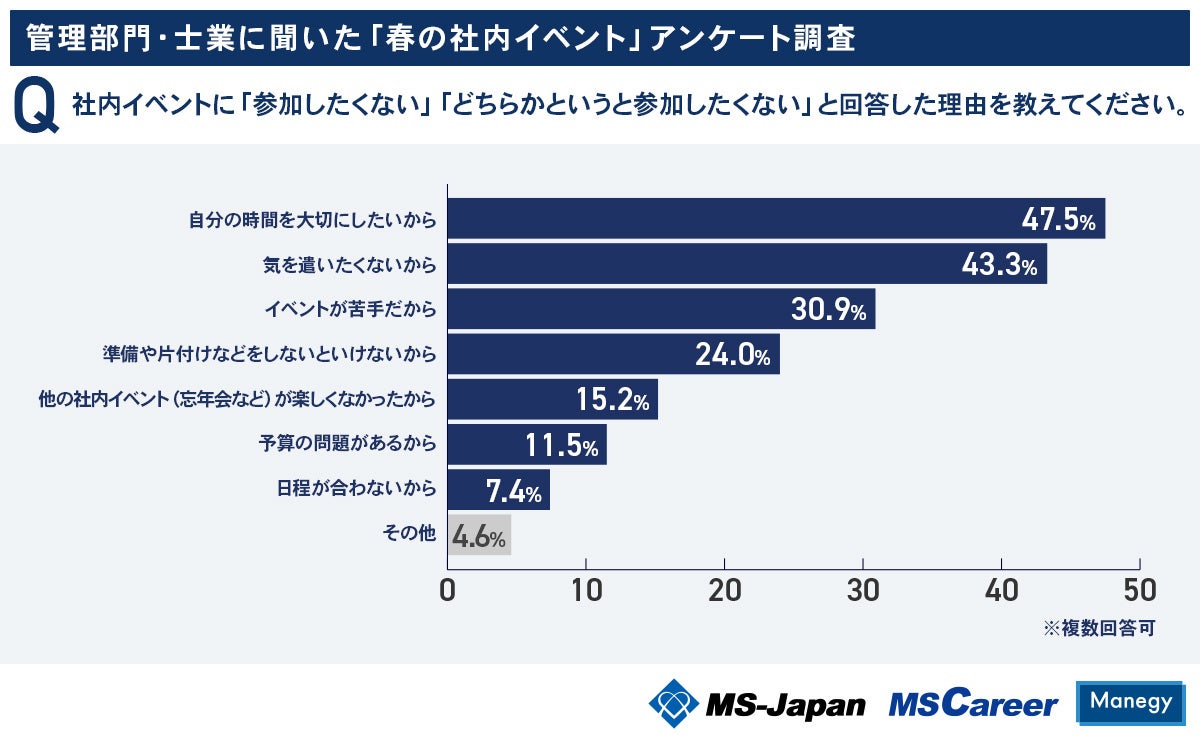 次に、社内イベントに「参加したくない」「どちらかというと参加したくない」と回答した人に理由を聞きました。割合が多い順に、「自分の時間を大切にしたいから」が47.5%、「気を遣いたくないから」が43.3%、「イベントが苦手だから」が30.9%という結果でした。
