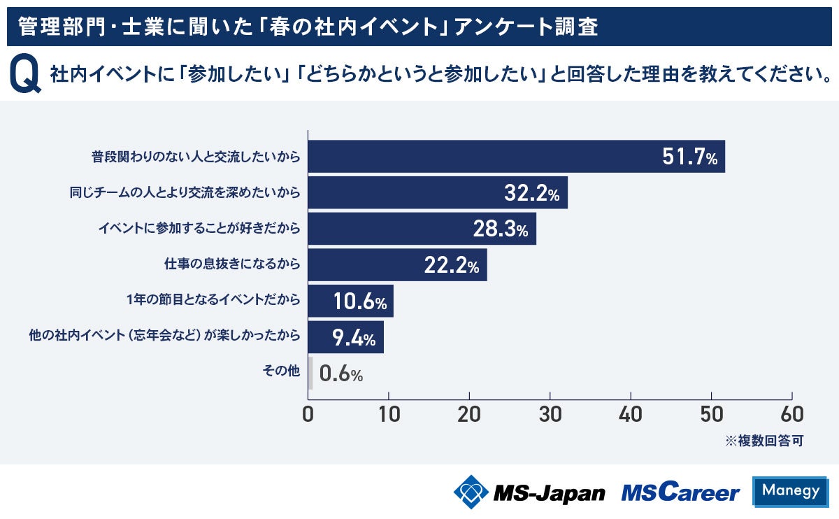 春の社内イベントに「参加したい」「どちらかというと参加したい」と回答した理由を聞いたところ、最多は「普段関わりのない人と交流したいから」で回答者の51.7%を占めていました。