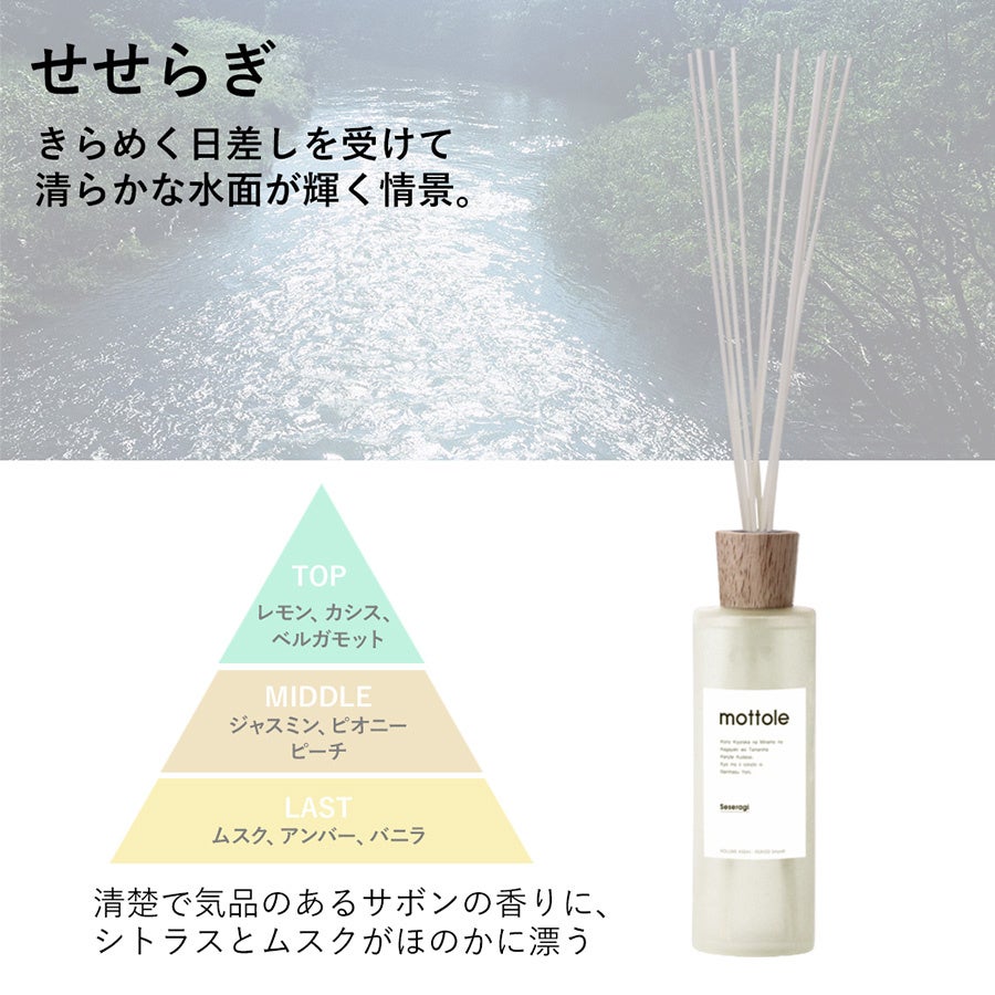 累計販売数10,000本を突破したmottoleリードディフューザーシリーズに新しい香り「せせらぎ」が登場。詰替用フレグランスオイルも同時発売。