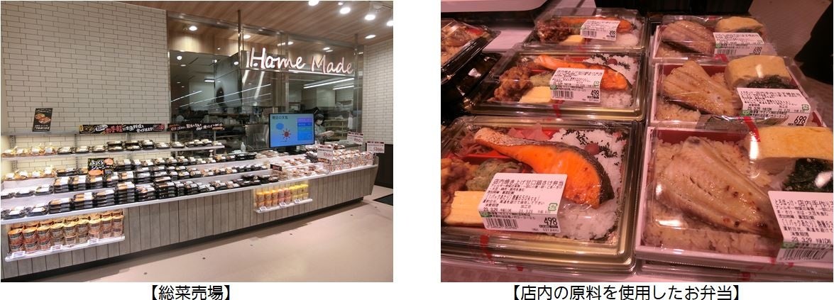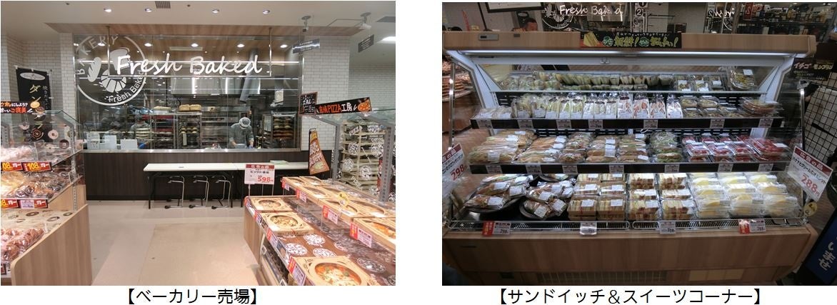 新設されたベーカリー売場では、店内で手作りしたピッツァをはじめ、ローストビーフサンドや海老アボカドサンドなどの冷蔵サンドイッチや旬のいちごを使用した贅沢いちごのフルーツタルトなどのスイーツを取り揃えています。総菜売場では、店内調理の煮魚・焼魚、お肉総菜をまとめて販売し、また、それらのお総菜を盛り込んだお弁当や丼物の品揃えを増やしました。