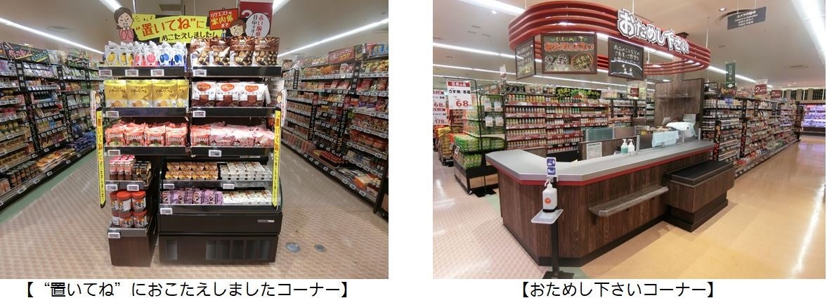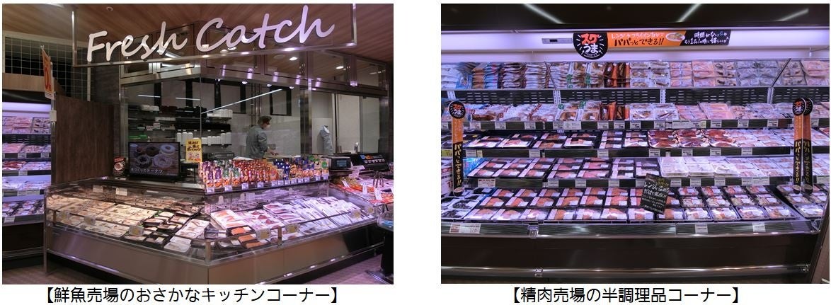 鮮魚売場におさかなキッチンコーナーを新設し、お客様のご要望に合わせて三枚卸しなどの調理を承ります。精肉売場では半調理品やレンジアップ商品の品揃えを充実させました。当社のおすすめ商品を試食・試用していただく「おためし下さい」コーナーや、お客様のご要望に応えした商品が揃う「“置いてね”におこたえしました」コーナーも新設しました。