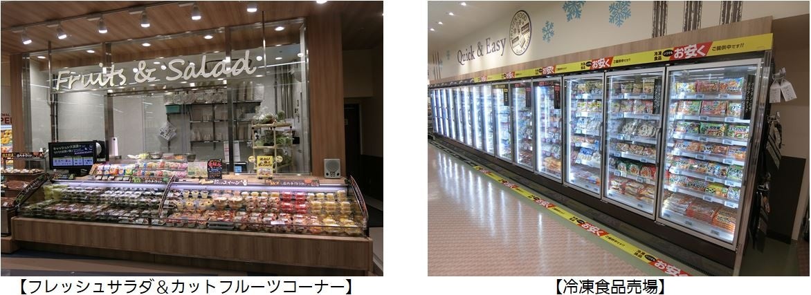 青果売場に新設された「フレッシュサラダ&カットフルーツコーナー」では、店内の原料を使用し、手作りしたサラダや旬なくだものを盛り込んだカットフルーツを多く取り揃えます。冷凍食品・アイスクリーム売場では、省エネ対応の新しい什器を導入し、商品の種類を増やしました。