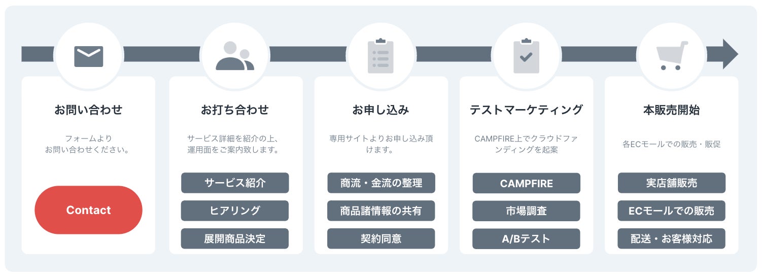 クラウドファンディング(テストマーケティング)、販売チャネルの構築運用、顧客対応、配送管理、各種広告まで一貫支援