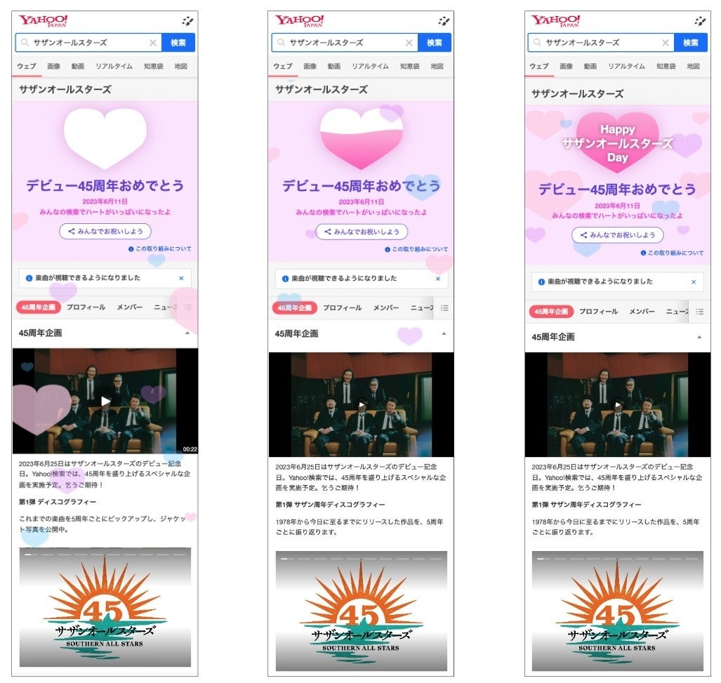 本機能の提供と合わせて、サザンオールスターズのデビュー45周年を記念した特別企画も同時に公開しました。2023年6月25日の午前0時から午後11時59分までの期間、「Yahoo!検索」で“サザンオールスターズ”(https://yahoo.jp/5ByQq8)と検索をすると、45周年をお祝いするハートのメーターが表示される本機能に加えて、45年間を振り返るサザン周年ディスコグラフィーを公開しました。ディスコグラフィーの他にも、サザンオールスターズのデビュー45周年を盛り上げるスペシャルな企画を実施しました。