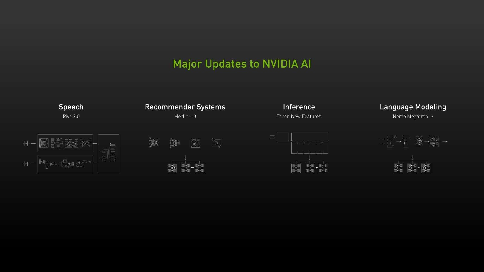 開発者が無料で利用できる NVIDIA AI には、音声 AI の NVIDIA Riva とスマート レコメンデーションの NVIDIA Merlin™ が含まれています。どちらも現在一般提供されています。 NVIDIA Triton、NeMo、Maxine、TAO Toolkit などのツールを含む、ソフトウェア スイート全体もアップデートされました。