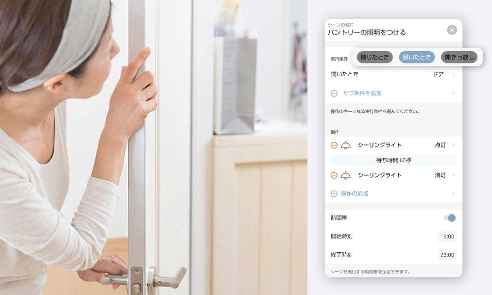 「パントリーの扉を開けると照明ON+1分後にOFF」「10:00~18:00に窓を開けるとエアコンOFF」など、いつもの操作を簡単に自動化。