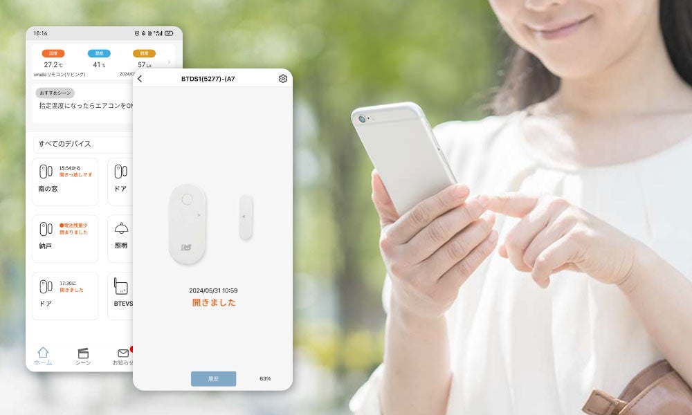 アプリで開閉状態が確認できるほか、開閉に応じて「スマホ通知」や「家電操作」を実行させることも可能。工事不要の電池式で、どこでもスマートに設置できます。