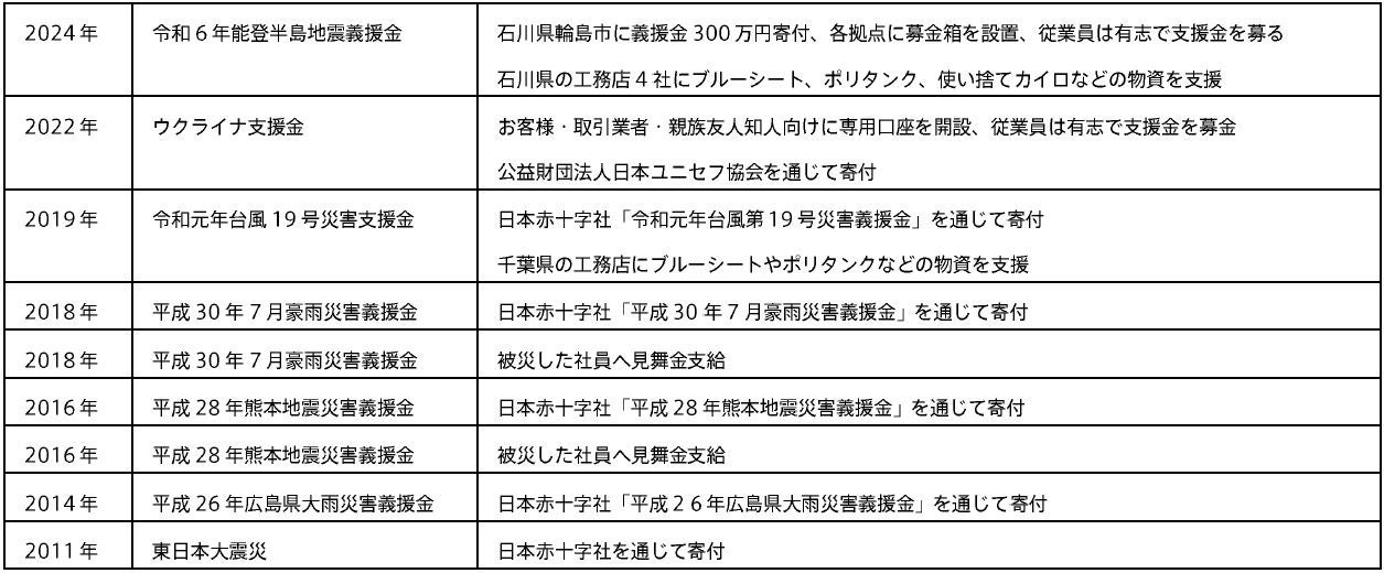 当社はこれまでにESG経営の理念のもと、皆様に安心安全な暮らしを提供するため相互扶助活動を進めてまいりました。自然災害の支援として、2011年 東日本大震災の際には、1棟ご契約につき義援金を拠出する義援金付き注文住宅「OPTIS(オプティス)」の販売や、社員や取引業者からの義援金を募り、日本赤十字社に1500万円の寄付を実施。弊社が主宰していたJAHBnet(ジャーブネット)※1会員を通じて、物資提供や仮設住宅建築で復興支援を実施、大きな被害を受けたJAHBnet(ジャーブネット)※1会員工務店への物資救済支援を行いました。また、2014年広島県大雨災害、2016年熊本地震、2018年7月西日本を中心にした豪雨災害、2019年東北・関東を中心にした台風19号災害の際には、全国の当社モデルハウス等へ募金箱の設置や、社員や取引業者など相互扶助の精神を共にするつながりで義援金を集めました。