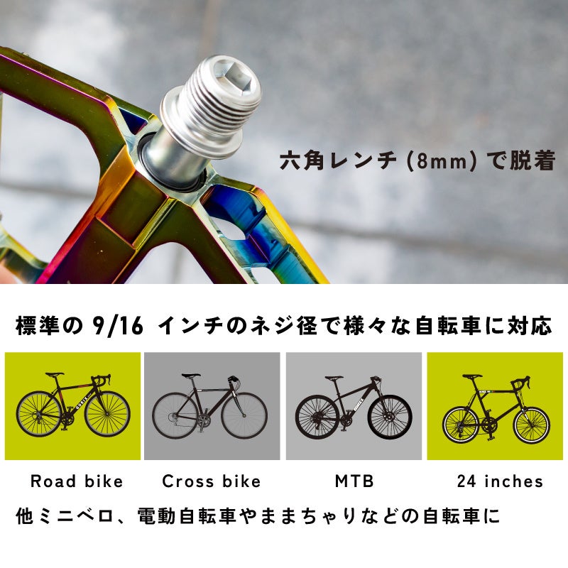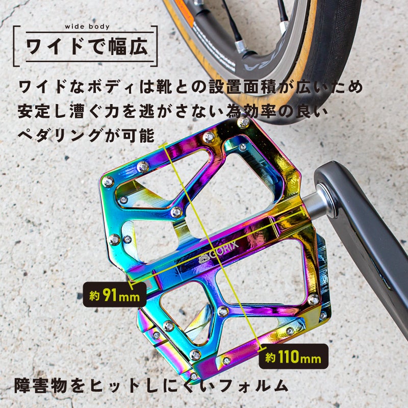 ワイド幅に薄型で軽量、そして滑らかな回転が特徴のフラットペダルです。綺麗で美しいオイルスリックカラーは自転車の印象を変えるので機能面だけでなくカスタマイズの一歩にも最適です。
