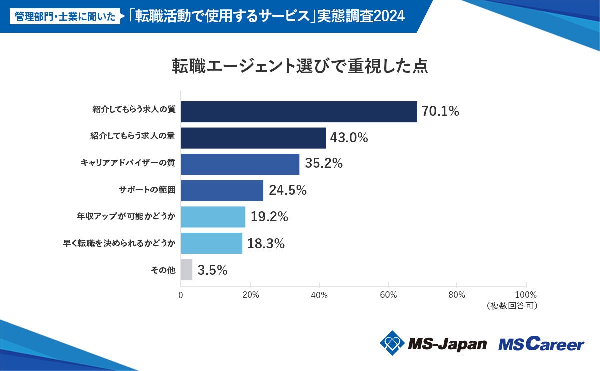 転職エージェントを選ぶ際に重視した点を聞いてみると、「紹介してもらう求人の質」を重視している方が70.0%を占めていました。