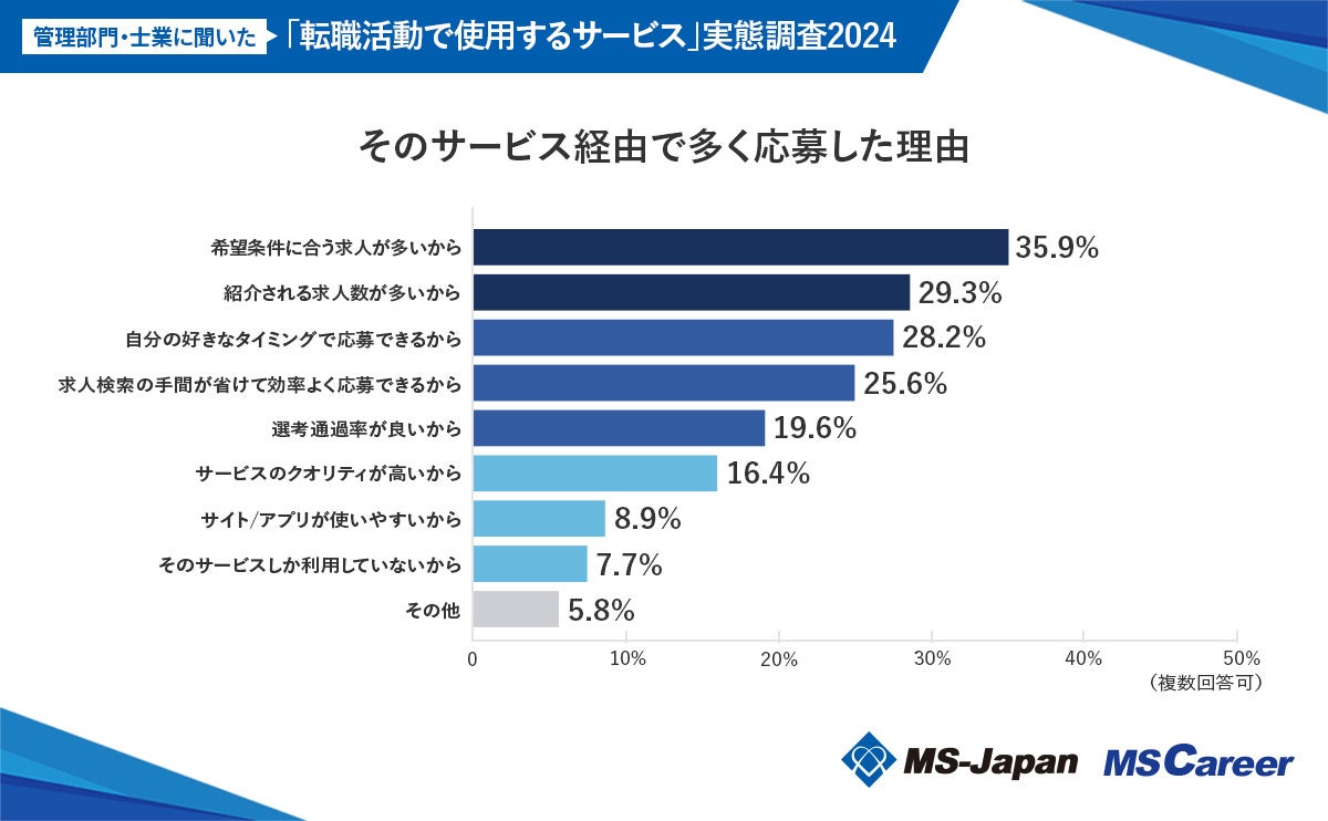 上記のサービス経由で応募した理由としては、「希望条件に合う求人が多いから」が35.9%、次点で「紹介される求人数が多いから」が29.3%と続きました。