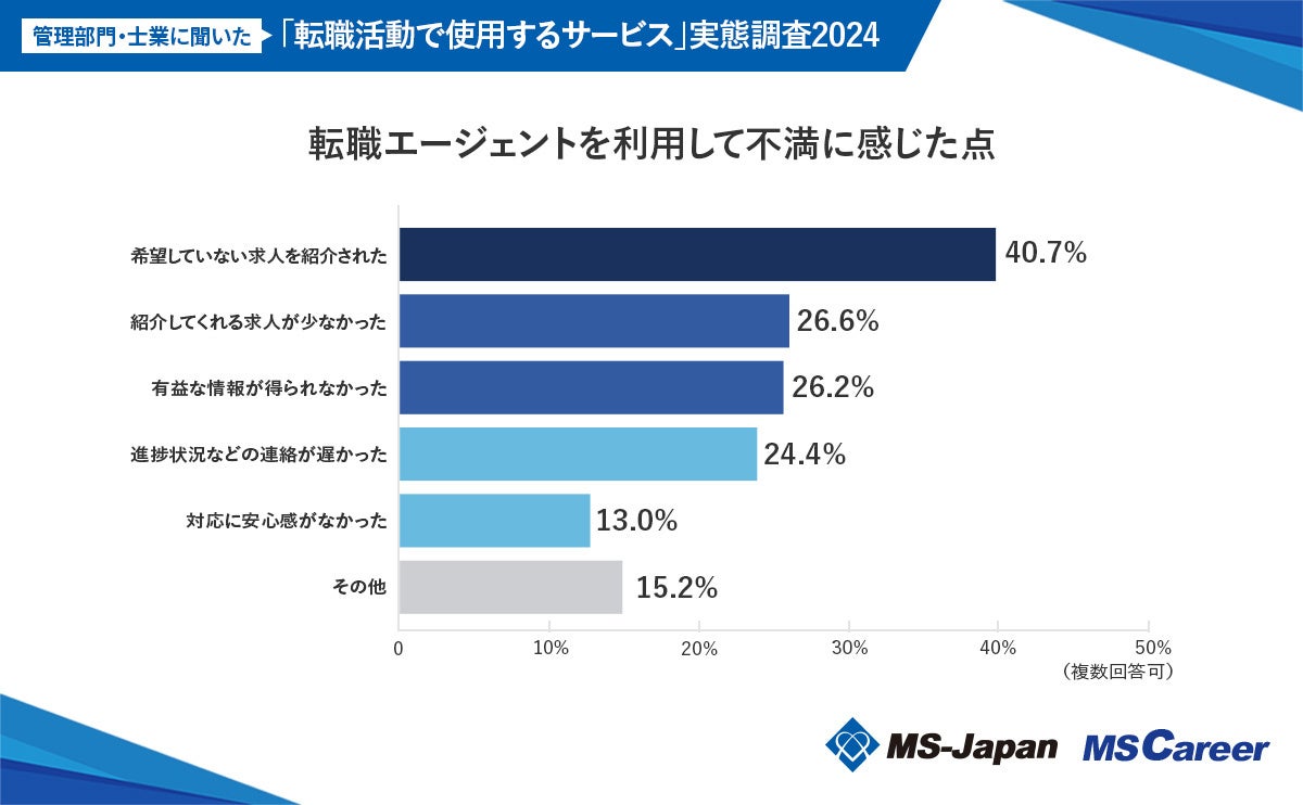 一方、転職エージェントを利用して不満に感じた点では、「希望していない求人を紹介された」が40.7%、「紹介してくれる求人が少なかった」「有益な情報が得られなかった」がそれぞれ26.6%という結果でした。