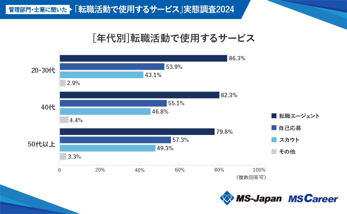 年代別では、20・30代の「転職エージェント」の利用率が高く、年代が上がるにつれて「自己応募」「スカウト」を利用する方の割合が増えていることが分かります。