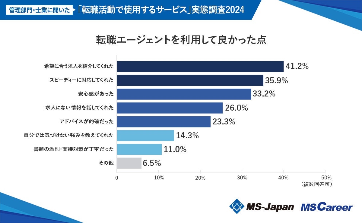 転職エージェントを利用して良かった点を聞いてみると、多い順に「希望に合う求人を紹介してくれた」41.2%、「スピーディーに対応してくれた」35.9%、「安心感があった」33.2%という結果でした。