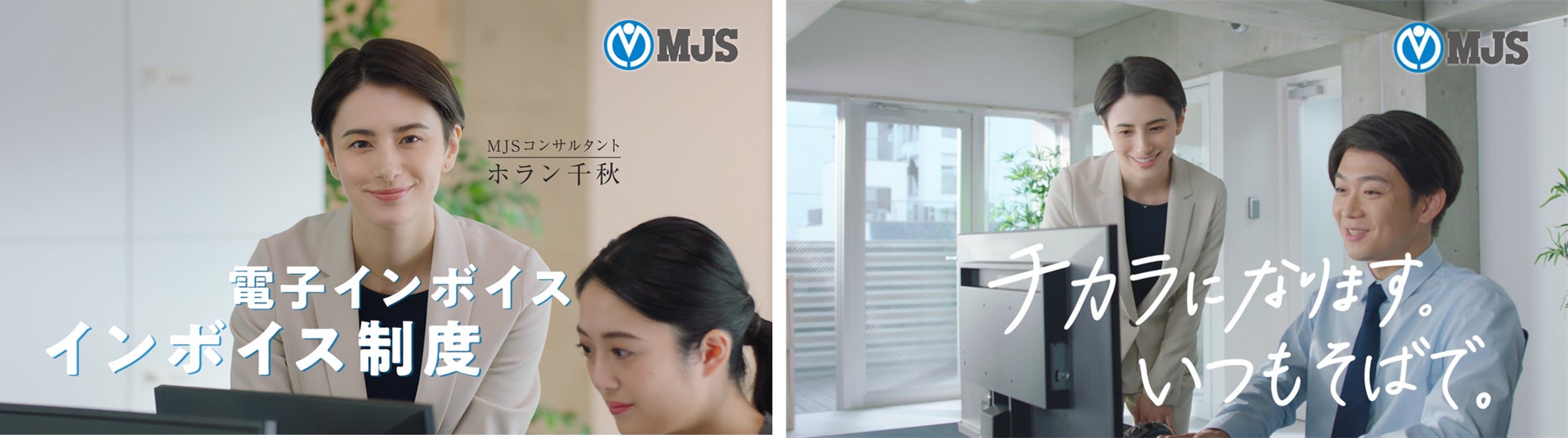 CMのコンセプトは、「チカラになります。いつもそばで。」。ホラン千秋さん扮するMJSのコンサルタントが、対応を迫られる電子帳簿保存法とインボイス制度について「準備はできていますか?」と問いかけます。対応しなければと分かってはいるけれど、なかなか手が付けられていない企業の担当者に向けて、法改正、新制度への対応が万全なMJSが、電子帳簿保存法やインボイス制度への対応はもちろんのこと、お客さまに合わせた各種ソリューションを提供し、課題解決に向けていつもそばで支え続けることを訴求します。