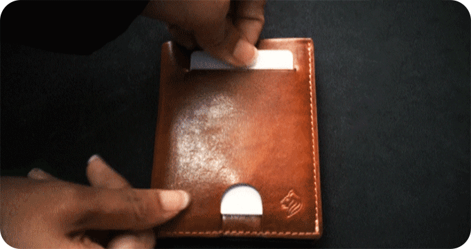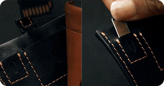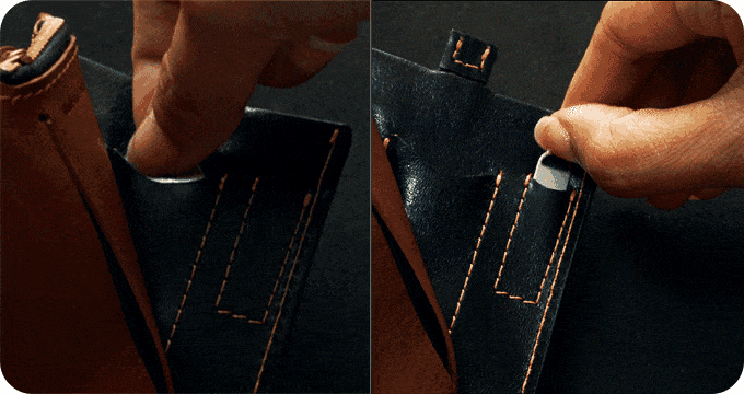 良質なイタリア産フルグレインの植物タンニンなめしでできており、15枚のお札やメモ、1枚のSDメモリーカード、12枚のクレジットカード、1枚のナノSIMカード、10枚のコイン、1つのピンタンブラーキー、1枚の非接触型カード、1つのSIM取り出し用ピンなどの日常に使用する40アイテム以上を収納することができます。