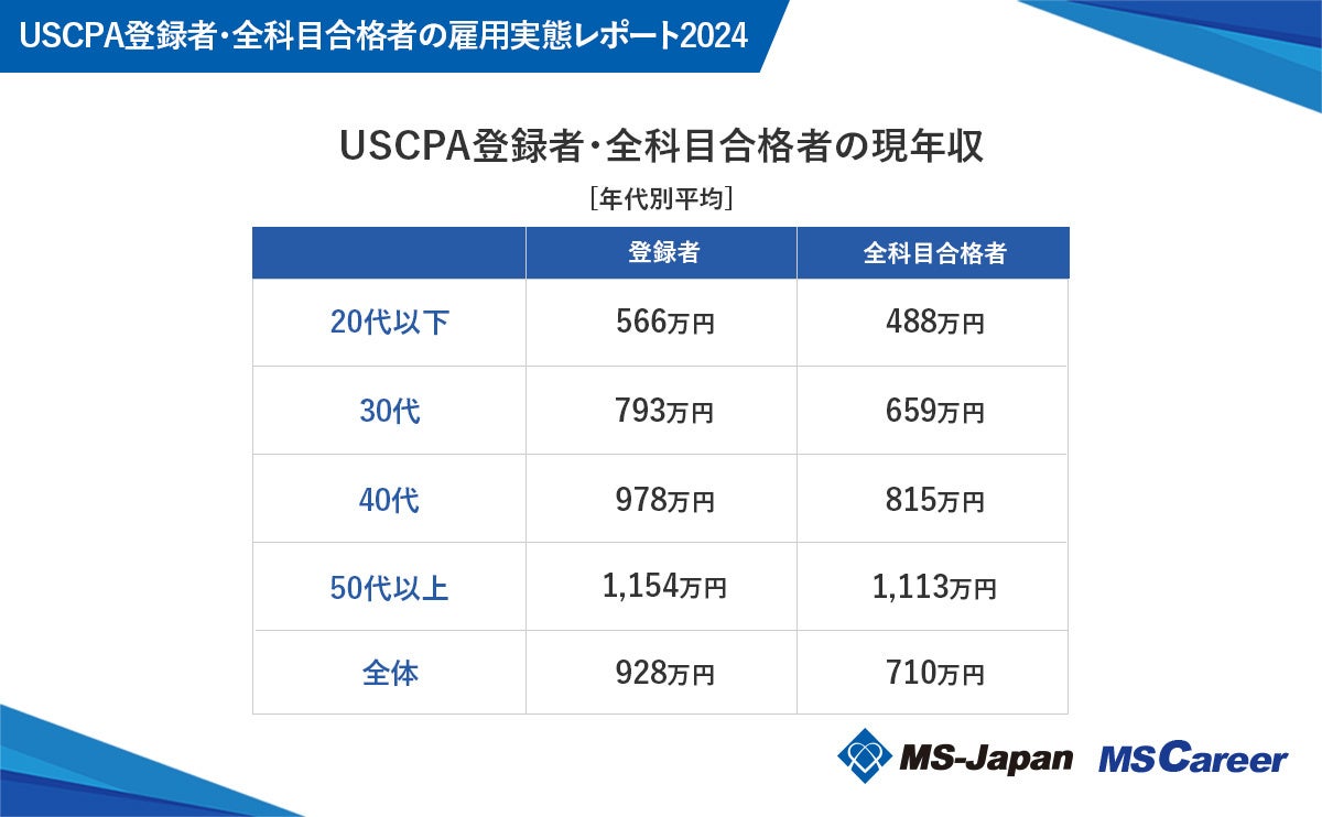 続いて、USCPA登録者・全科目合格者の現年収を年代別にまとめました。