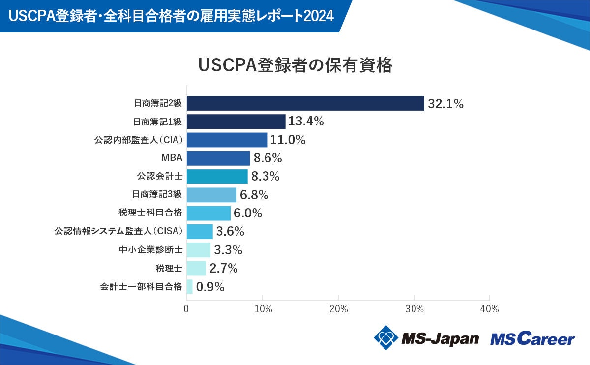 USCPA登録者においては、多い順に「日商簿記2級」が32.1%、「日商簿記1級」が13.4%、「公認内部監査人(CIA)」が11.0%という結果になりました。