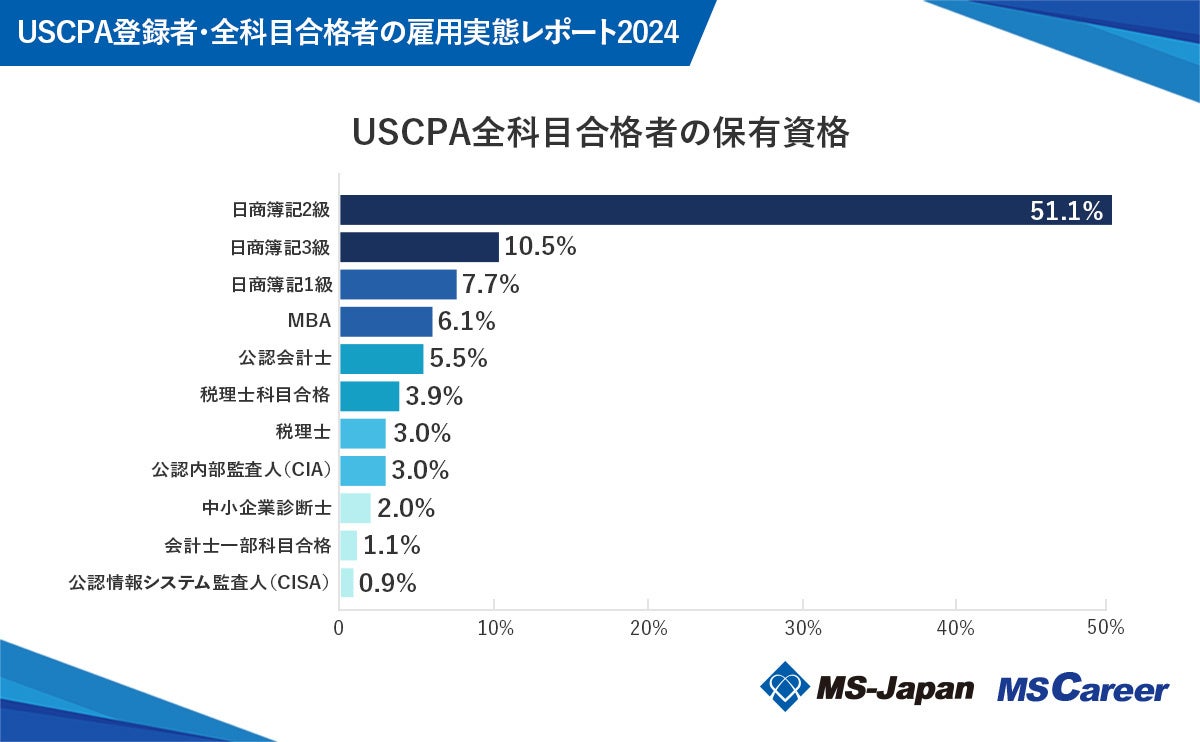 USCPA全科目合格者は、「日商簿記2級」を保有している方が51.1%と全体の半数以上を占める結果となりました。