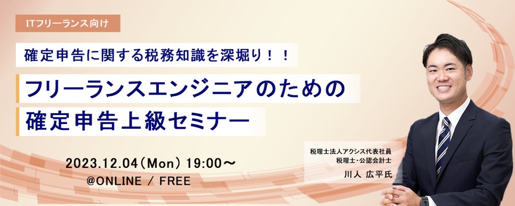 本セミナーでは、ITフリーランスエンジニアにて「既に基本的な確定申告の知識がある方」「これまでご自身で確定申告をされている方」を対象に、「節税対策」や「2023年確定申告の改正点」や「電子帳簿保存法の改正」などについて解説します。
