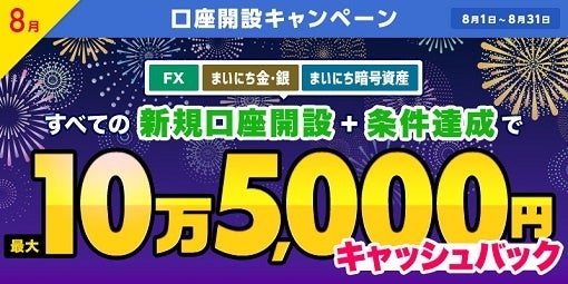 株式会社 マネーパートナーズ(代表取締役社長:福島秀治、本社:東京都港区、以下「当社」)は、2022年8月の新規口座開設者向けキャンペーンとして、『FX(外国為替証拠金取引)、まいにち金・銀(CFD-Metals)、まいにち暗号資産(暗号資産CFD)』新規口座開設と条件達成で最大105,000円をキャッシュバックするキャンペーンを実施いたします。