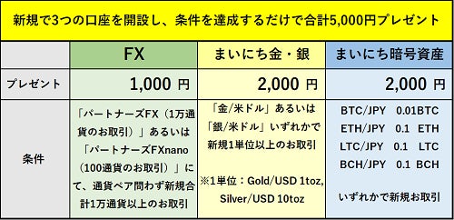 8月に新規でFX口座を開設されたお客様に対して、開設の翌月末までに以下の条件を達成で最大5,000円をプレゼントいたします。