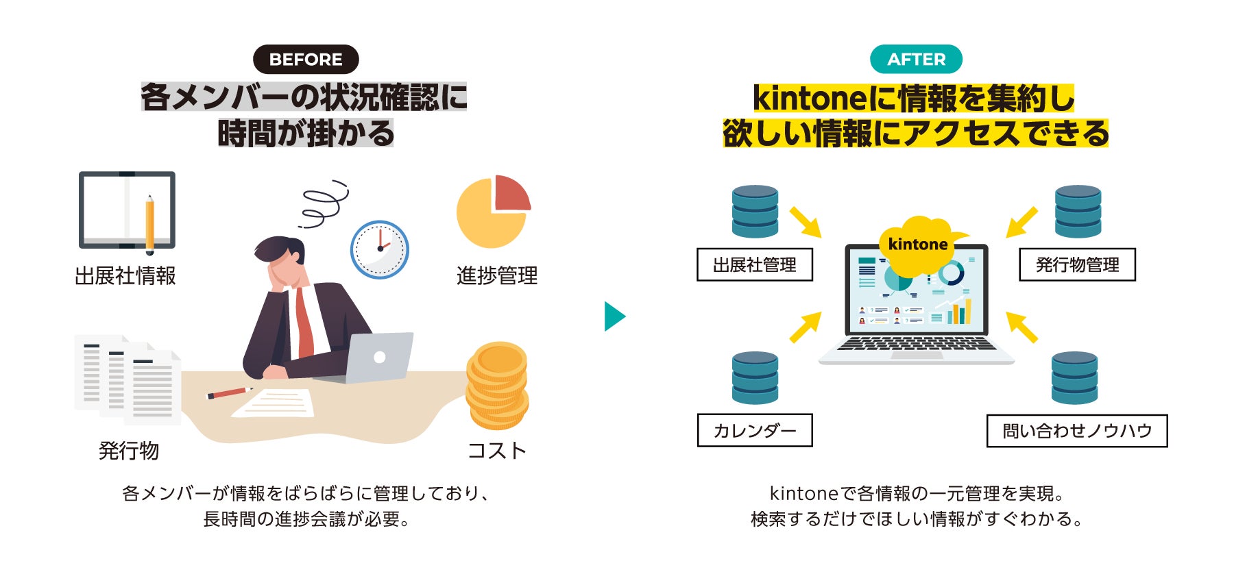 出展社管理、カレンダー、問い合わせノウハウの蓄積、発行物管理などにkintoneを活用することで、定例会議時間の削減や業務効率化の実現を目指します。