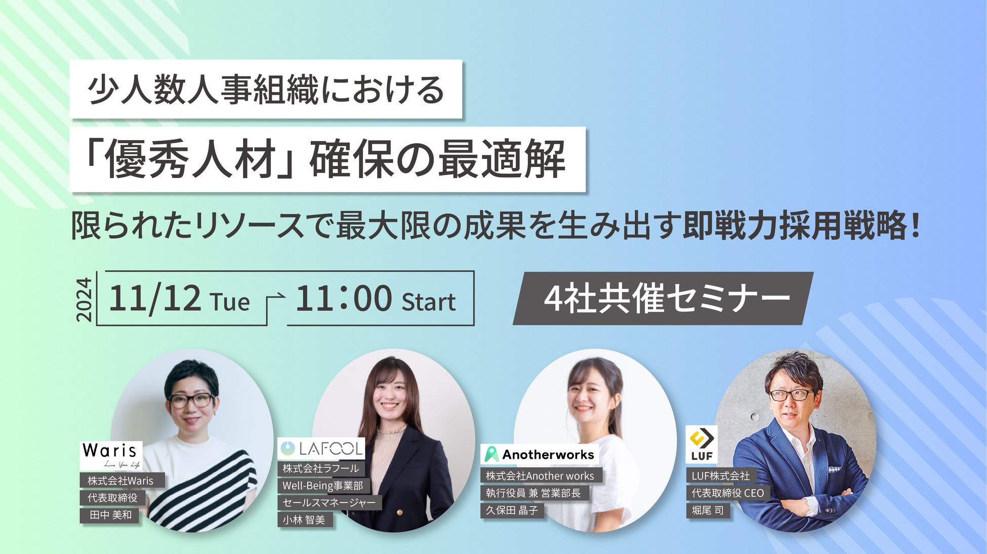 人的資本/ウェルビーイング経営支援の株式会社ラフール(本社:東京都中央区、代表取締役社⻑:結木啓太 以下「ラフール」)は、2024年11月12日(火)に「少人数人事組織における「優秀人材」確保の最適解」をテーマとしたセミナーを、株式会社Another works、LUF株式会社、株式会社Warisと共催でを開催します。