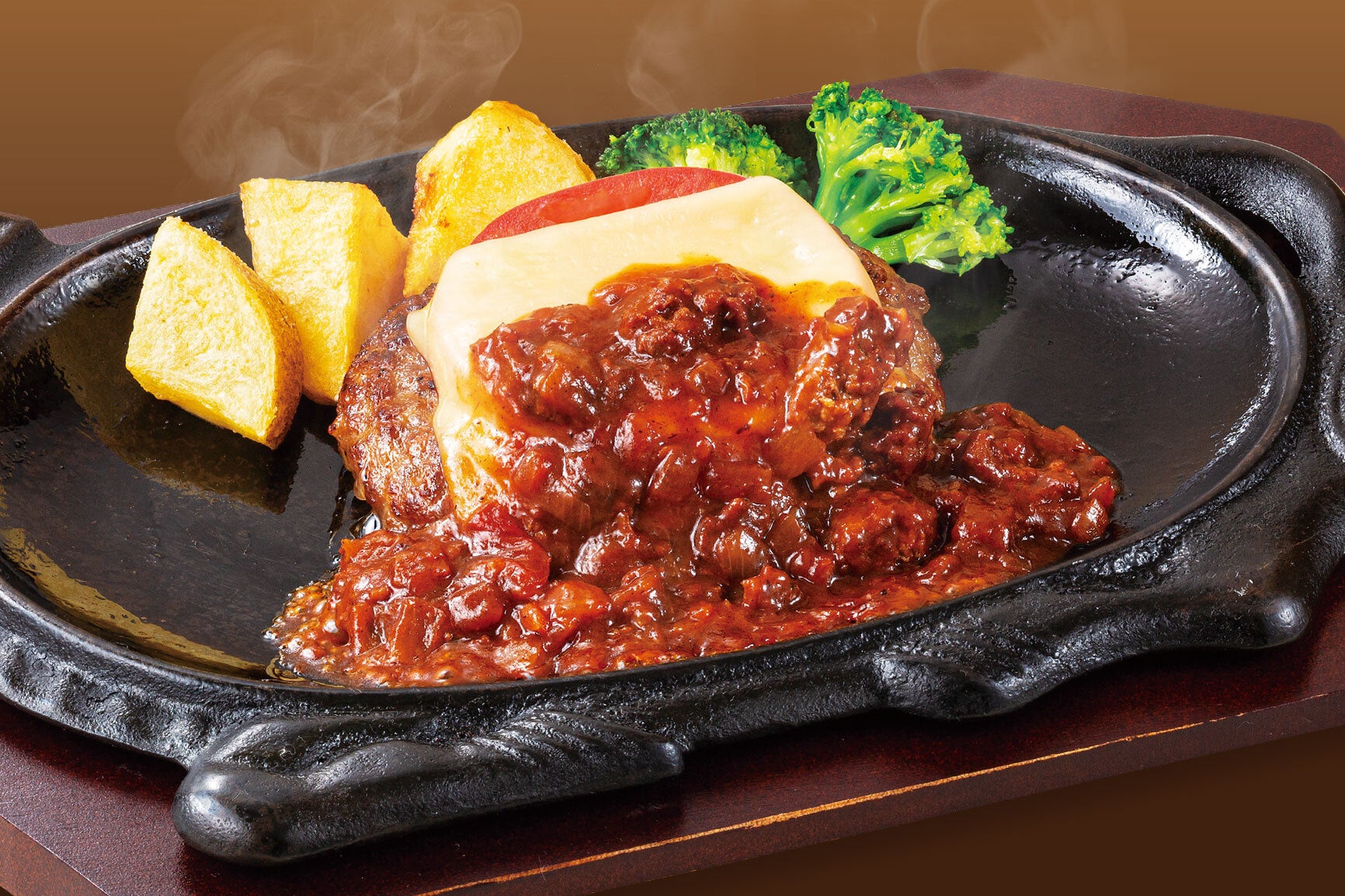 <牛100g>ハンバーグに、グリルして旨味を閉じ込めたトマトスライス、コクのあるゴーダスライスチーズを乗せ、ごろっとしたひき肉が入って食べ応えのあるフォルクス特製ミートソースを大胆に流しかけました。焼き立てパンにも、ライスにも合うこの夏イチオシの新作です。