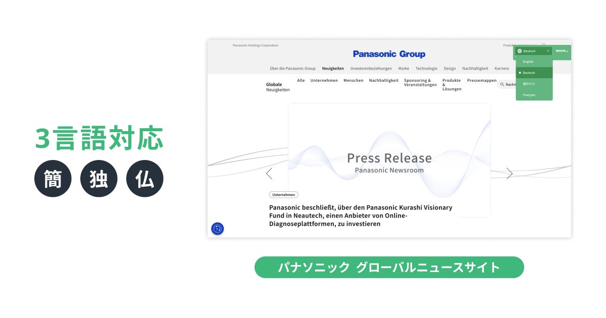 パナソニックグループのグローバルニュースサイトを、WOVN.io で簡体字・ドイツ語・フランス語に対応しています。非英語圏の中でもアクセス数の多い中国語とドイツ語、またグローバルに展開可能なフランス語の3言語を選定いたしました。