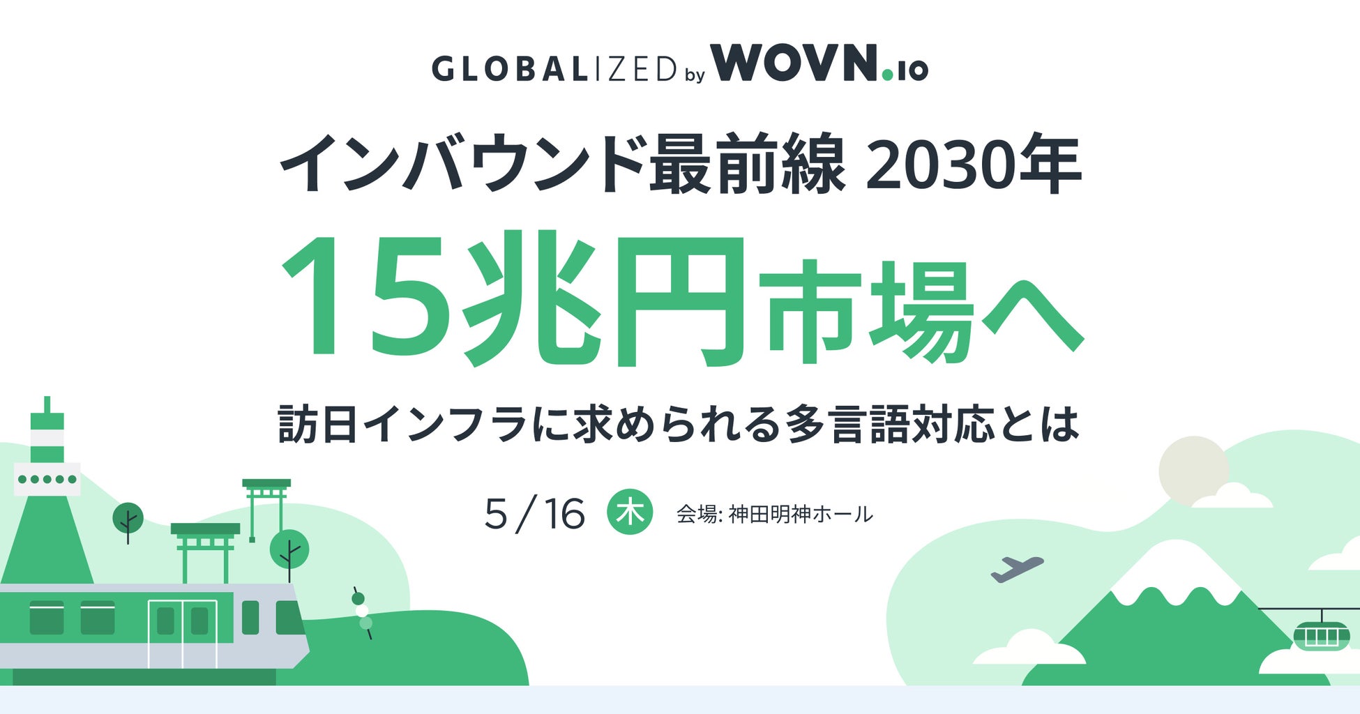 Web サイト多言語化ソリューション『WOVN.io(ウォーブン・ドットアイオー)』を提供する Wovn Technologies株式会社(本社:東京都港区、代表取締役社長:林 鷹治、以下 WOVN)は、2024年5月16日(木)12時から大手企業向け GLOBALIZED インバウンドカンファレンス『インバウンド最前線 2030年15兆円市場へ 〜 訪日インフラに求められる多言語対応とは 〜』を無料開催いたします。神田明神ホールでの会場開催の他、オンラインからもご視聴いただけます。