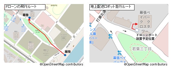 本実証実験では、幕張ベイパーククロスタワー&レジデンス(マンション内外)および若葉3丁目公園にて、ドローンをマンション付近まで飛行させ、積載した荷物をドローンポートを介して地上配送ロボットへ受け渡し、エレベーターを経てマンション個宅の玄関前まで配送する実験を行います。