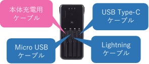 本体充電用のUSBケーブルに加え、スマートフォンの充電用に3タイプのケーブルを内蔵。モバイルバッテリーとしても使用可能。