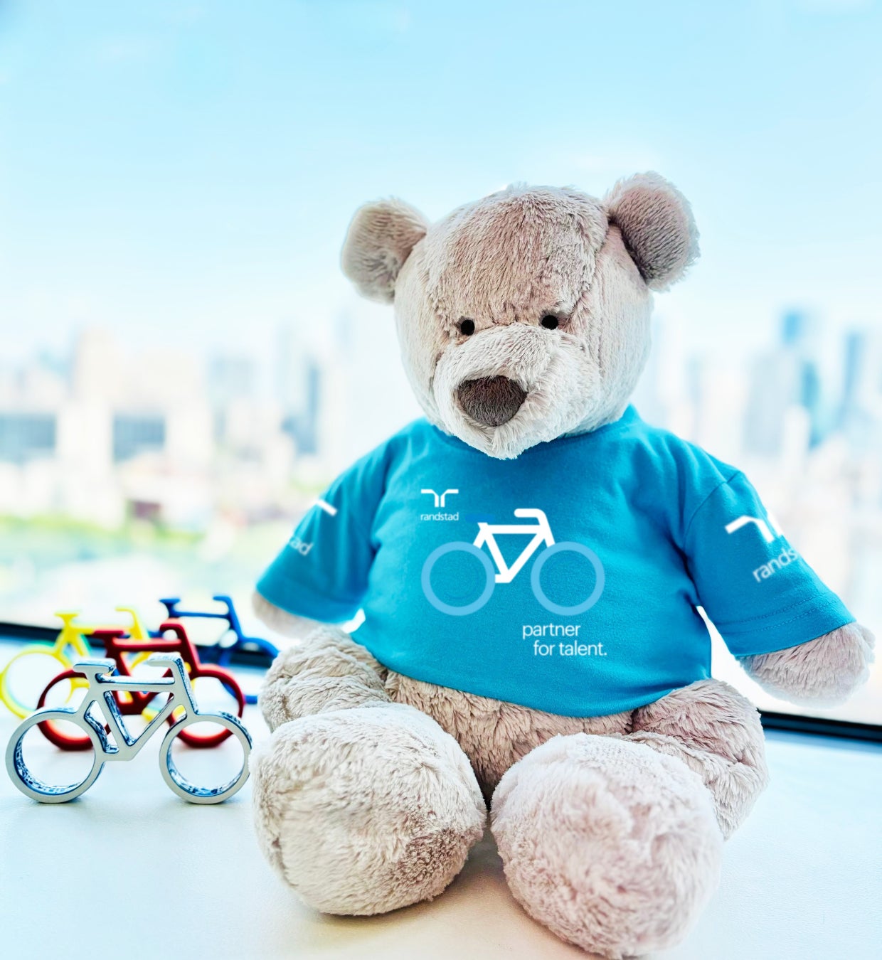 このたび、抽選でプレゼントするのはランスタッドのオリジナルTシャツを着たぬいぐるみとAmazonギフトカードです。オリジナルTシャツには、1960年にオランダで創業したランスタッドが、創業者自らが働き手を自転車の荷台に乗せて就業先まで送り届けるところから始まったというエピソードからしばしば使用するモチーフ、自転車のイラストをあしらい、年齢・性別を問わず好かれるデザインといたしました。