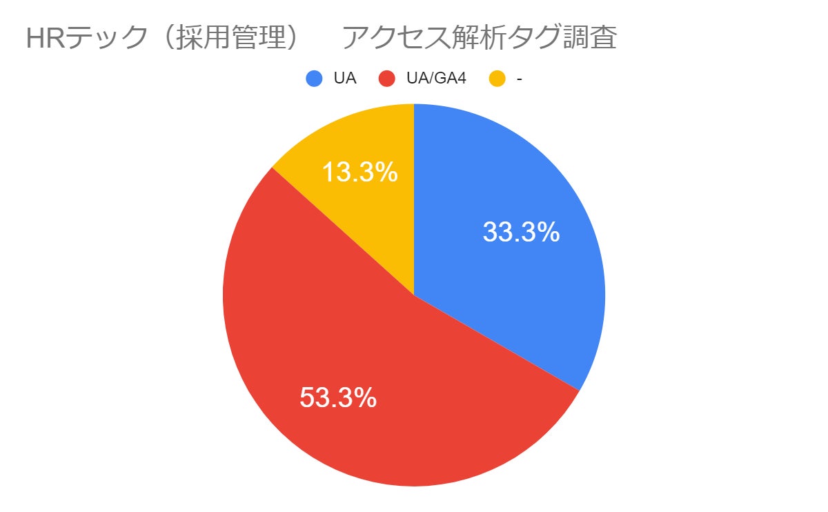 以下は、ChromeDevToolsを使用し、通信上で呼び出されているGA4またはUAタグを確認し集計した結果です。20サイトを確認したうち、UAのみを導入しているサイトが全体の33.3%、GA4も導入されているサイトが53.3%、GA4のみのサイトは無く、Googleの解析タグが確認できないサイトが13.3%で、ここまで調査した業界の中では最も多い割合でGA4への移行が進んでいます。