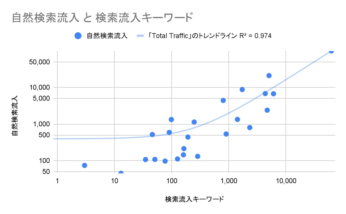 自然検索流入と流入キーワード数の相関は非常に強い