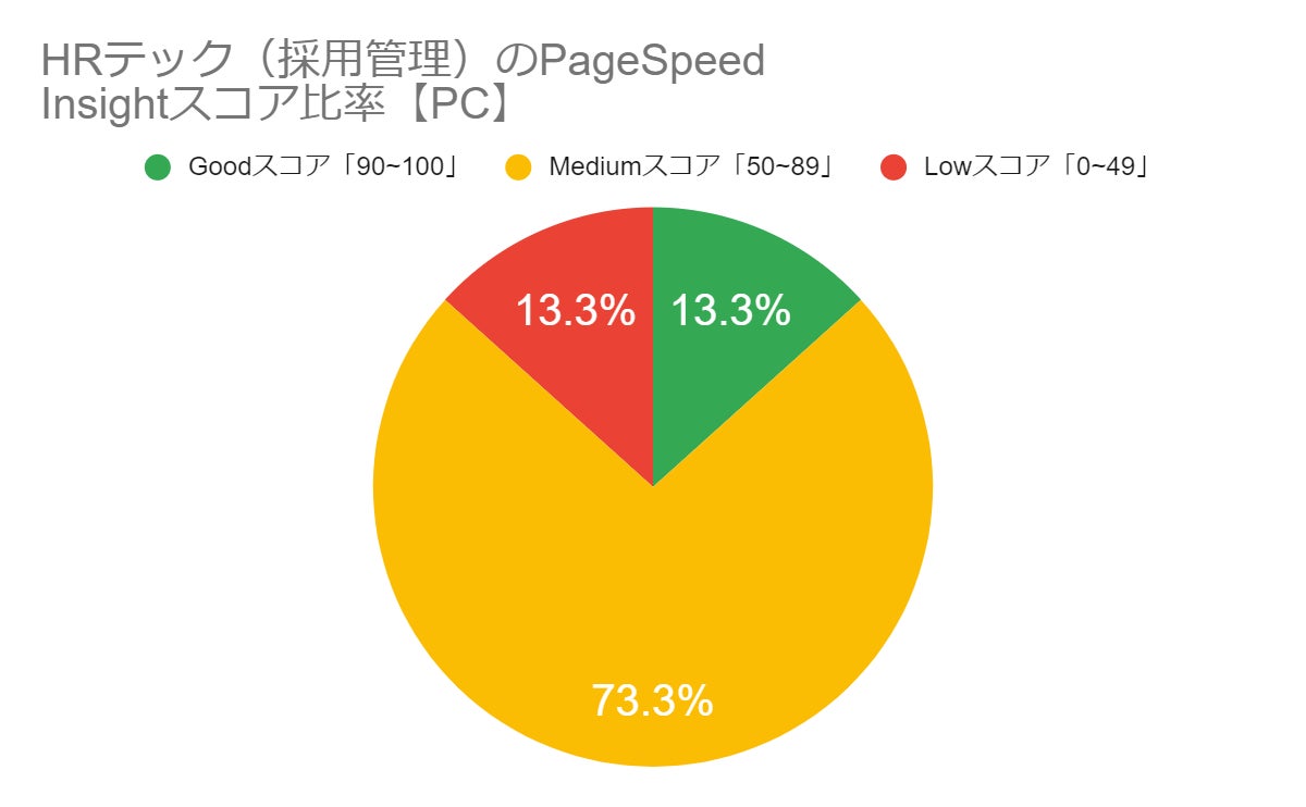 以下は、PageSpeed InsightsのAPIを使用し、HRテック(採用管理)業界30サイトについて調査した結果です。黄色で表示されるMediumスコアの比率が73.3%、赤色で表示されるLowスコアとページスピードの改善がほぼ必要ないGoodスコアがともに13.3%という結果でした。