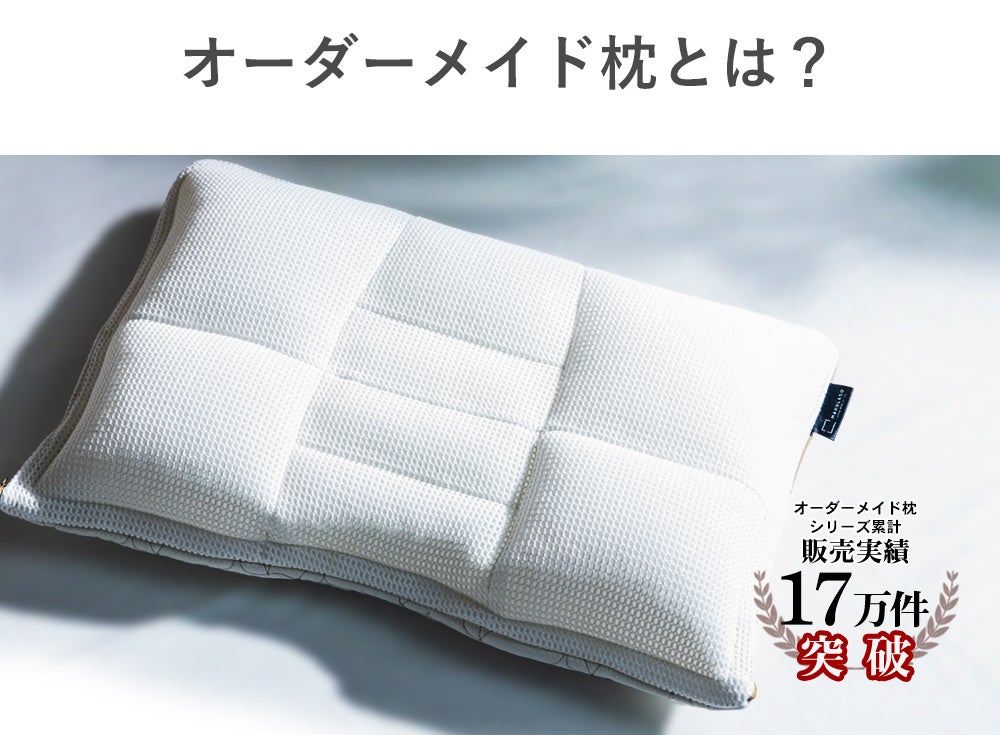 この枕は、お客様の身体のサイズを3か所計測し、中に詰める素材(中材)を枕の専門家マクラマイスターと一緒に10種類から選び抜く事でお一人おひとりにピッタリの高さ・固さを実現した世界に一つだけの枕です。