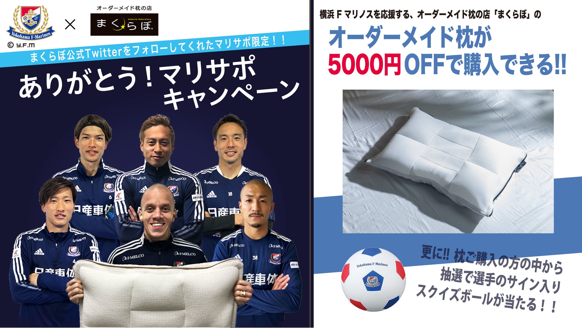 オーダーメイド枕の店まくらぼ(運営:Futonto株式会社 本社:東京都町田市 代表取締役社長:齊藤 淨一 以下、まくらぼ)は、まくらぼ公式Twitterの横浜F・マリノスのサポーター(以下、マリサポ)フォロワーに向けて、オーダーメイド枕をお得に購入できるキャンペーンを開始いたしました。
