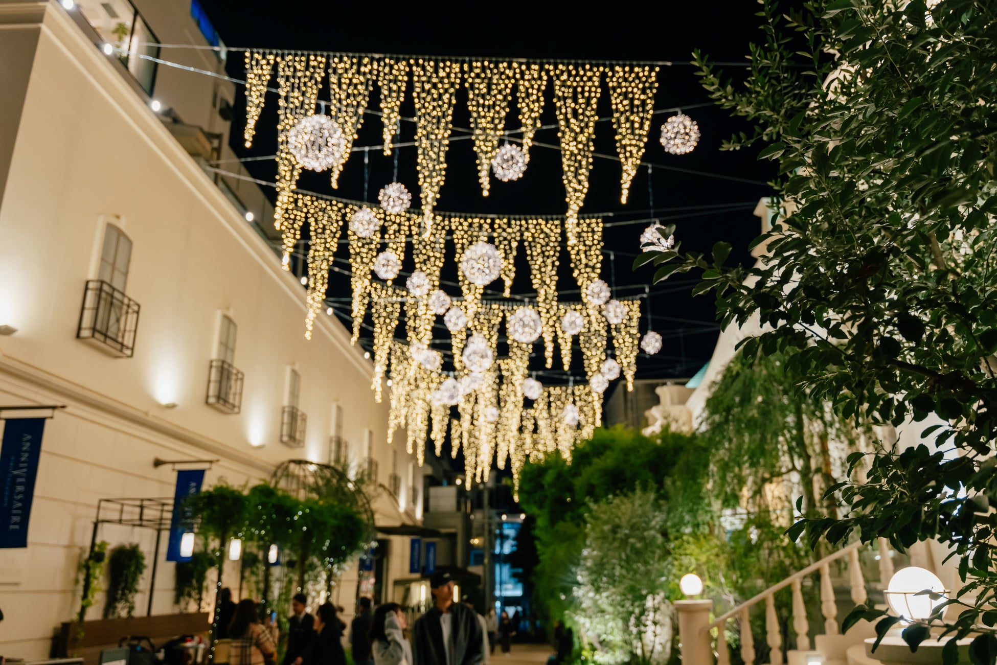 【記念日の館】「アニヴェルセル 表参道」がお届けするイベント『Anniversaire Holiday Season 2023』。今年のイルミネーションは、天から降り注ぐシャンパンゴールドの光が美しく表参道を彩ります。表参道の通りから館内へ入ると、エントランスに象徴的なクリスマスツリーと、天井からの光の演出が期間限定で登場。そして回廊を抜けた先のチャペル広場に初めてイルミネーションを施しました。気軽にテイクアウトしながら散策して、一層賑わう表参道の新スポットをお楽しみください。