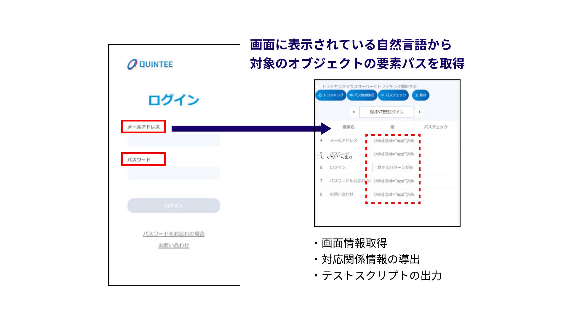 テスト実行を自動的に行う際の、「操作対象オブジェクト」及び「要素名」それぞれの表示位置に応じた対応関係情報を導出することにより、前記対応関係情報を取得し、画面に表示されている文字から対応する要素のパスを自動的に取得することができる技術です。例えば、Webサイトのログイン画面にある、IDとパスワードの入力タブのテストを自動実行したいときなど、本プログラムは、コンピュータに、テスト対象となるアプリケーションの画面情報を取得させます。取得した画面情報に基づいて、操作対象オブジェクトと要素名それぞれの表示位置に応じた対応関係を自動的に導出します。導出した対応関係情報とテスト情報に含まれる要素名に基づいて、テスト実行用のスクリプトを出力する処理を実行させることができます。