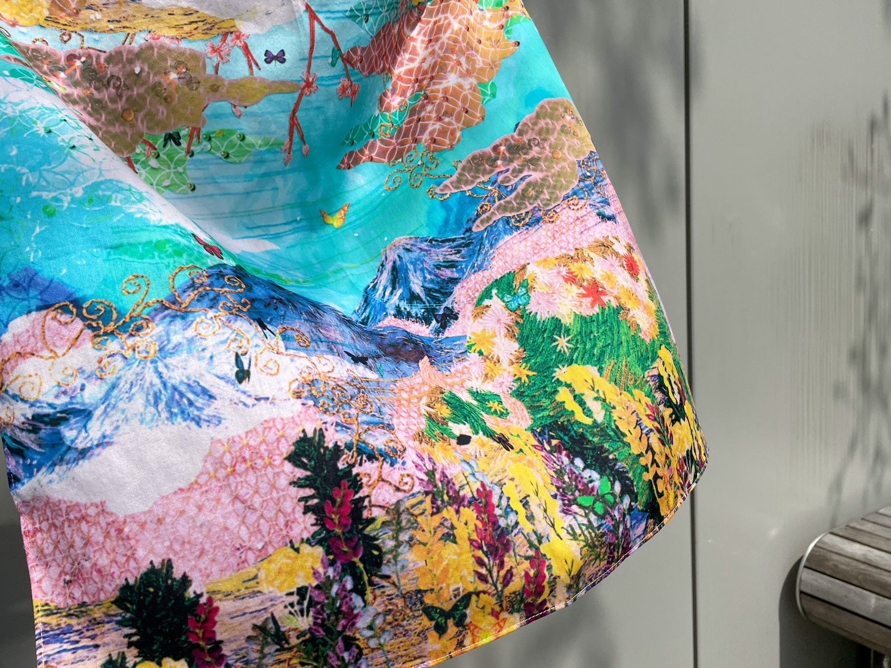 綿100%のサテン生地を採用し、サラっとした肌触りが特徴です。ハンカチの用途はもちろん、ヘアアクセサリーとして使ったり、バックチャームにしたりと、お客様ご自身で自由にお楽しみいただけるアイテムになっています。制作にあたり清川は「日常に美しい生命の息吹を手元に持って感じてもらえたら。」と商品への想いを語っています。