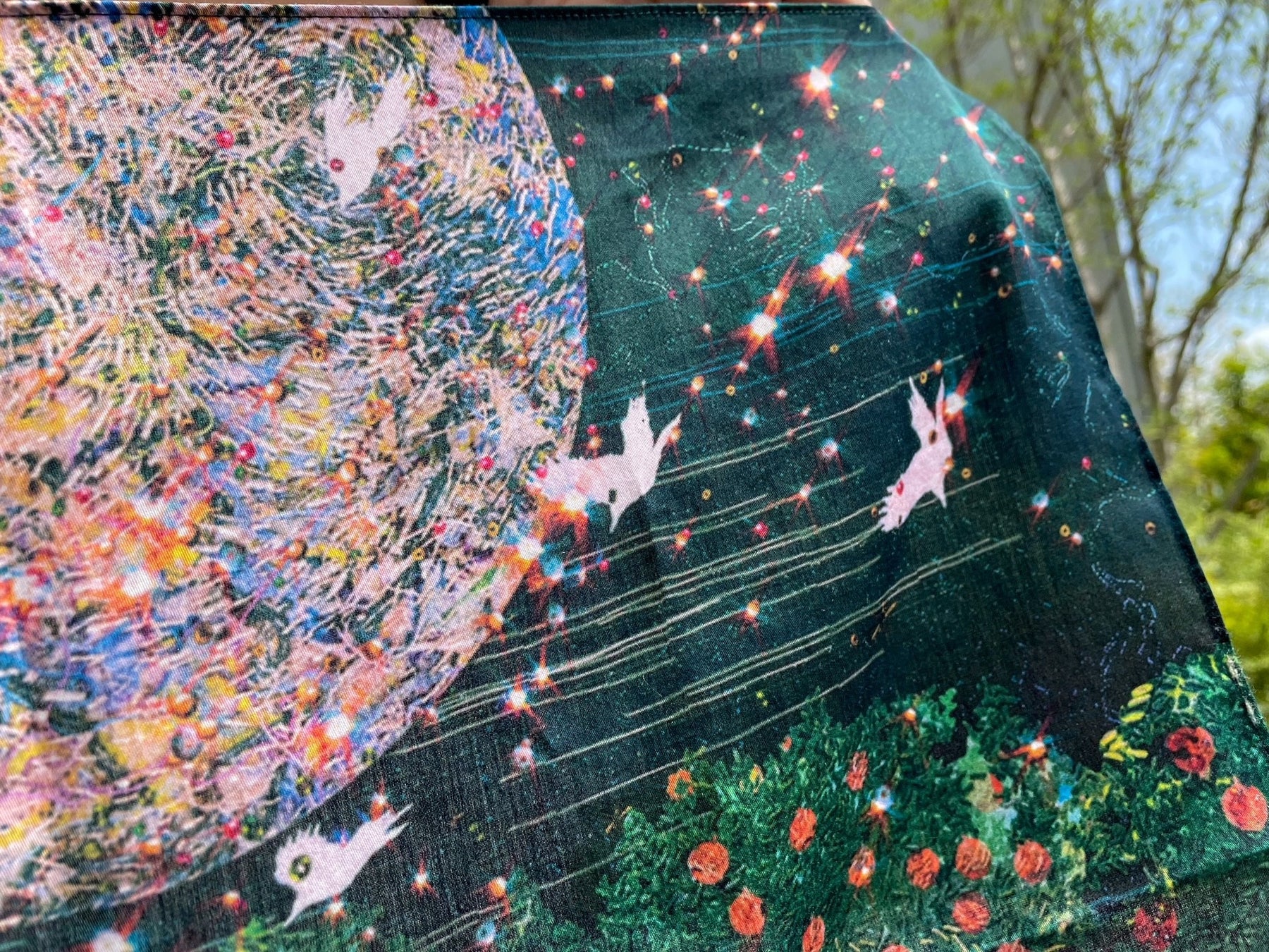 今回は銀座 蔦屋書店5周年を記念して、昨年12月にGINZA SIXのエントランスで公開された清川あさみによるデジタルアート《OUR NEW WORLD》とコラボレーションしたハンカチを販売します。「いのちと光の柱」をテーマに、生命の美しさを表現し、祈りや希望を込めて神話の世界と生命の「はじまり」を描いた作品です。そこに存在するのは、絶滅危惧種や自然、多様な命のモチーフ達。遥か昔から遠い未来へ紡がれる生命の神秘と、美しい精神の世界を描き出したシリーズとなっています。