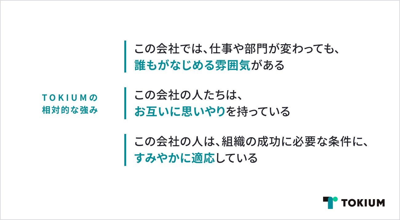 今回の調査結果から、同規模の企業と比較して、相対的にTOKIUMの強みといえる以下の3点が高く評価されました。