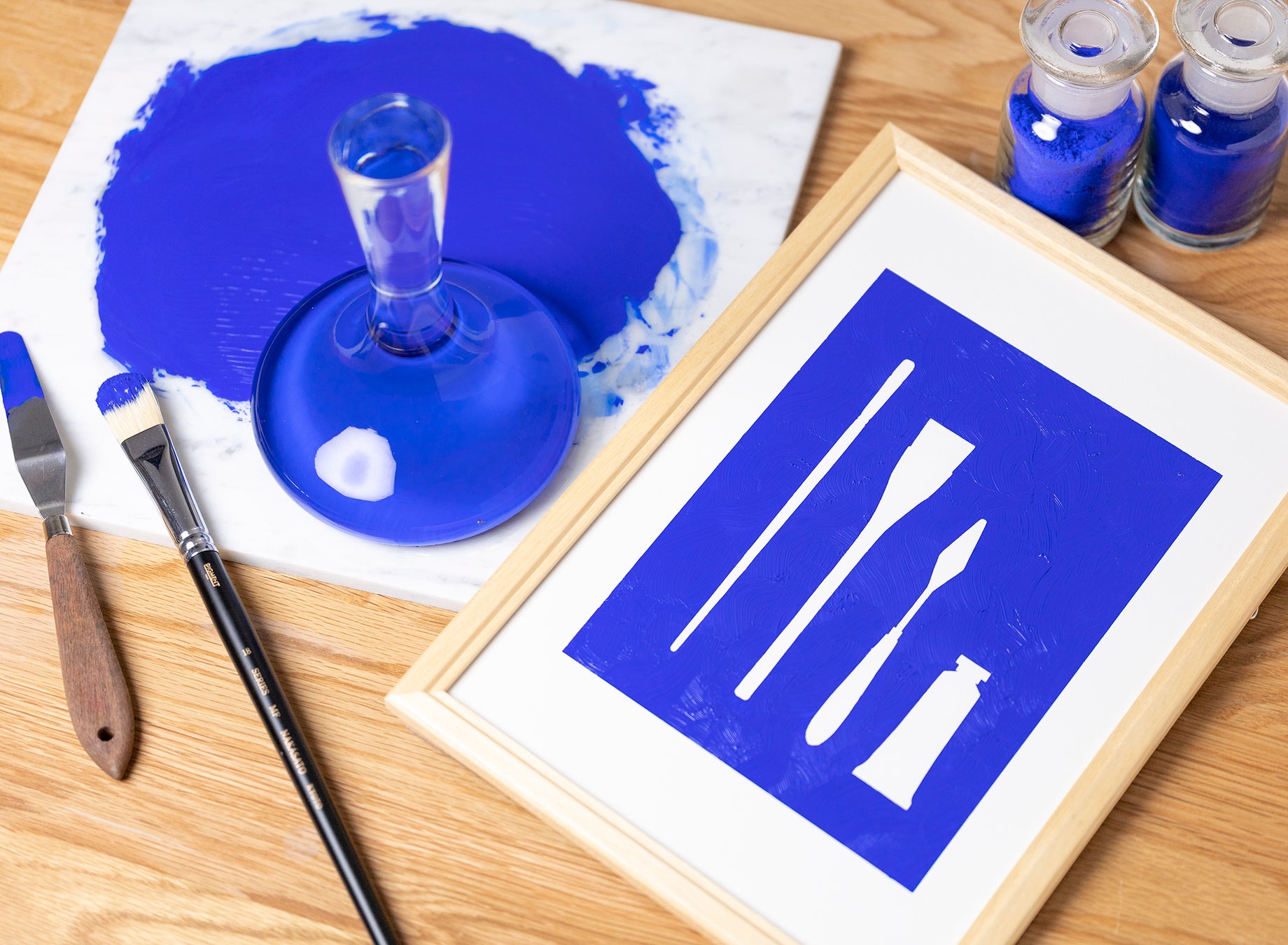 顔料を混色しながら自分だけのオリジナル「青」の油絵具を作る講座。できた絵具をキャンバスに塗ると、ブルーピリオドの漫画内に登場する画材のシルエットが浮かび上がります。完成後の作品は、フレームに入れてお持ち帰りいただけます。また、参加者が作成した「青」の油絵具は、スタッフの手により、100色の青で構成する《OUR BLUE》として展覧会場に設置されます。マスキングで縁取られた絵具チューブのシルエットと参加者全員による100色の「ブルー」を一望できます。