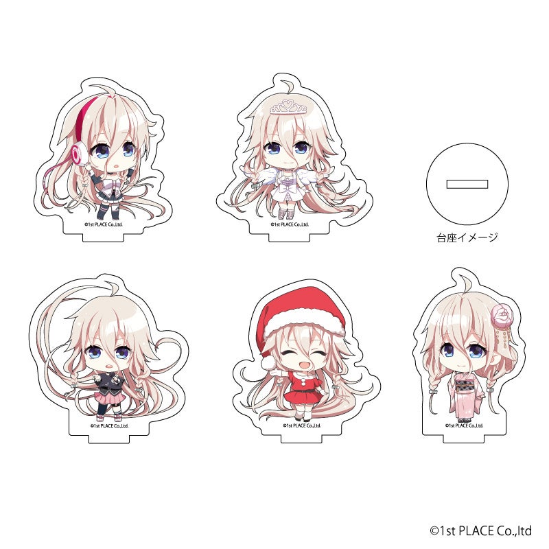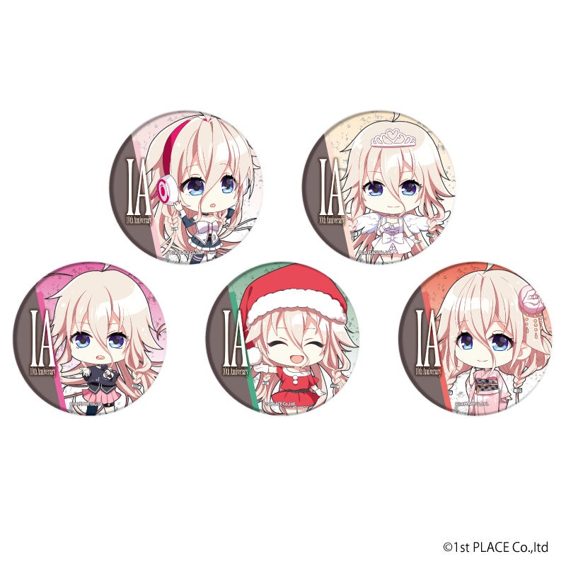 「レコーディング衣装ver.」「10TH ANNIVERSARY衣装ver.」「通常コスチュームver.」「サンタさんver.」「振袖ver.」のミニキャラが描かれています。カバンにつけたり、コレクションとしてお部屋に飾ったりして「IA」との日常をお楽しみください♪