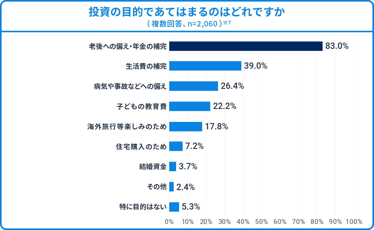 ※7 「あなたが『投資』をする目的として、あてはまるものをすべてをお選びください。 ※現在『投資』をされていない方は、今後『投資』をしたいと考える目的についてお答えください」への回答(複数回答、回答者数:2,060人、小数点第2位を四捨五入)